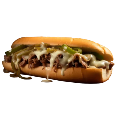 Grilled brisket, peppers, onions, cheese on Italian hero served with white sauce, hot sauce.