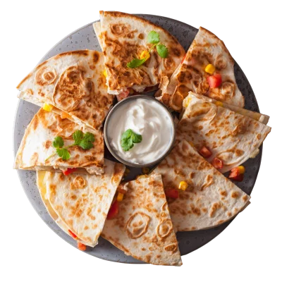 Grilled chicken, peppers, onions, cheese on tortilla served with white sauce